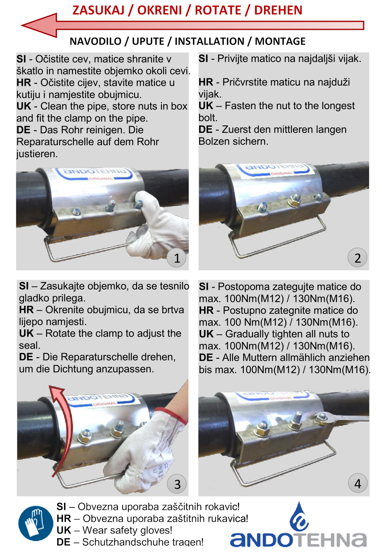 - Upozorenje: Andore reparaturne obujmice nisu primjerne za upotrebu kao zaštita od izvlačenja cijevnih spojeva.